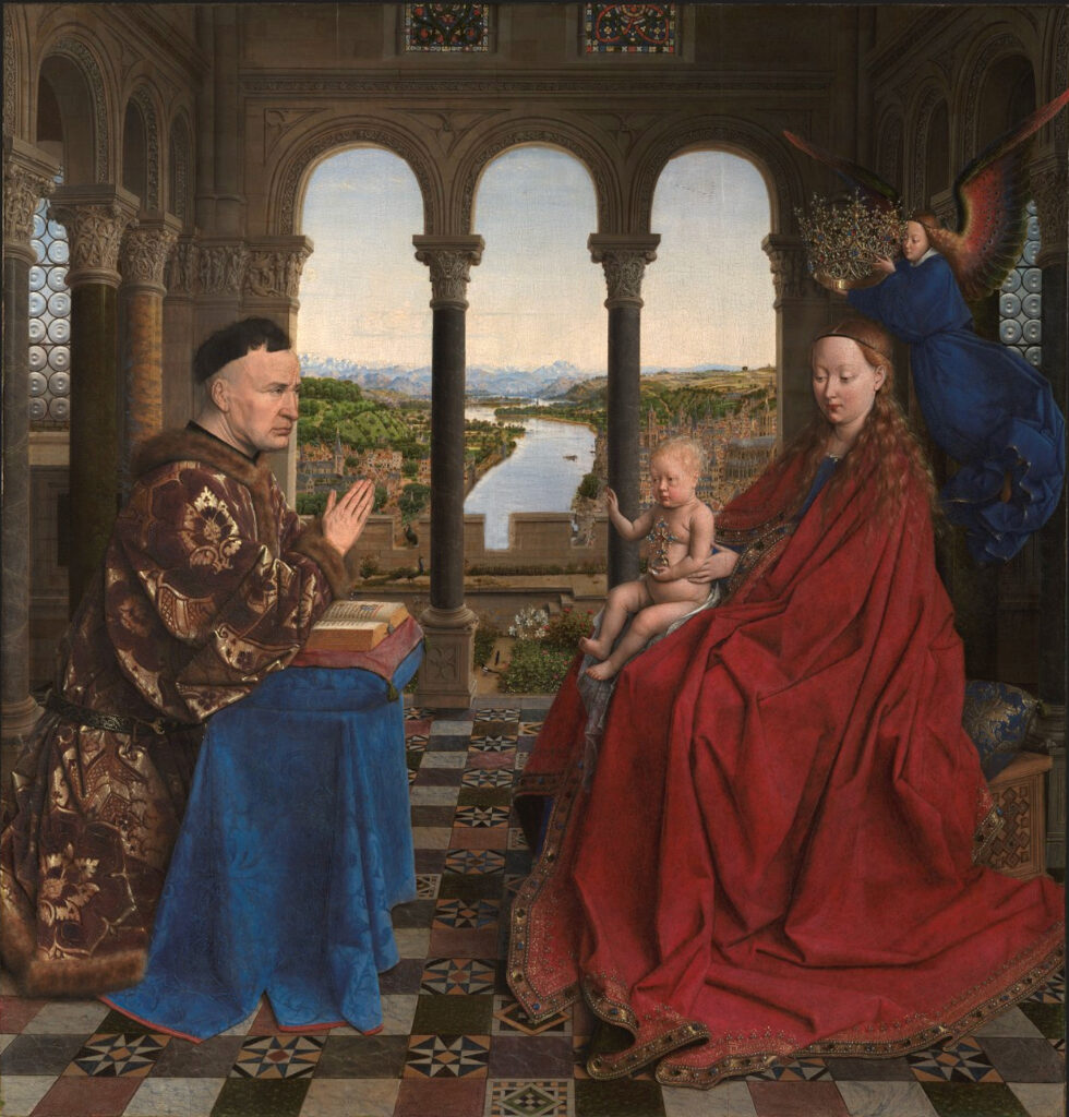 When you look at The Madonna of Chancellor Rolin, your eyes are directed not to the kneeling chancellor or to the Virgin and Child in the foreground but to the top third of the picture, directly toward the center, where a conspicuous island on a river interrupts the horizon. Although the chancellor occupies a considerable portion of the image, the viewer’s gaze must be actively diverted in order to rest on him or on the Madonna. Instead, the eye is irresistibly drawn to the center of the painting, to the river, the island, and upward toward the distant sky. This occurs regardless of the viewer’s distance or angle, which indicates that the painter intended the eye to travel toward the middle and upward through the picture’s vertical axis, indicating a movement of ascent.